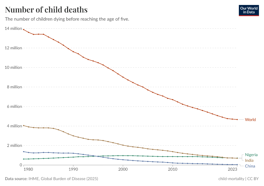 IHME, Global Burden of Disease (2024) – with minor processing by Our World in Data. “Number of child deaths” [dataset]. IHME, Global Burden of Disease, “Global Burden of Disease - Deaths and DALYs” [original data]. Retrieved June 26, 2025 from https://remove-datapage-tags.owid.pages.dev/grapher/number-of-child-deaths