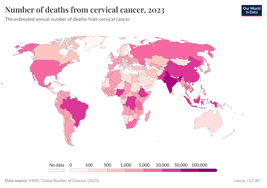 IHME, Global Burden of Disease (2024) – with minor processing by Our World in Data. “Number of deaths from cervical cancer” [dataset]. IHME, Global Burden of Disease, “Global Burden of Disease - Deaths and DALYs” [original data]. Retrieved June 26, 2025 from https://remove-datapage-tags.owid.pages.dev/grapher/number-of-deaths-from-cervical-cancer