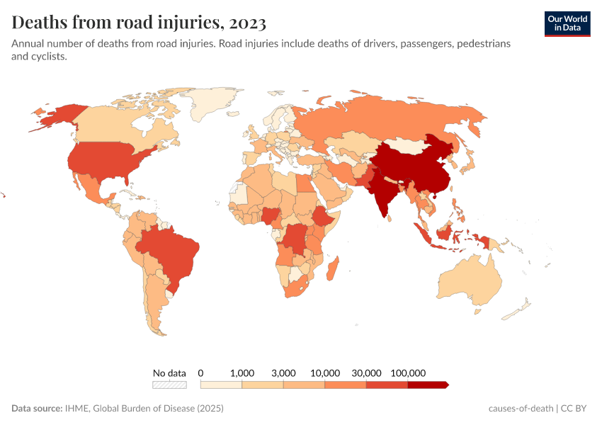 IHME, Global Burden of Disease (2024) – with minor processing by Our World in Data. “Deaths from road injuries” [dataset]. IHME, Global Burden of Disease, “Global Burden of Disease - Deaths and DALYs” [original data]. Retrieved June 26, 2025 from https://remove-datapage-tags.owid.pages.dev/grapher/number-of-deaths-from-road-injuries