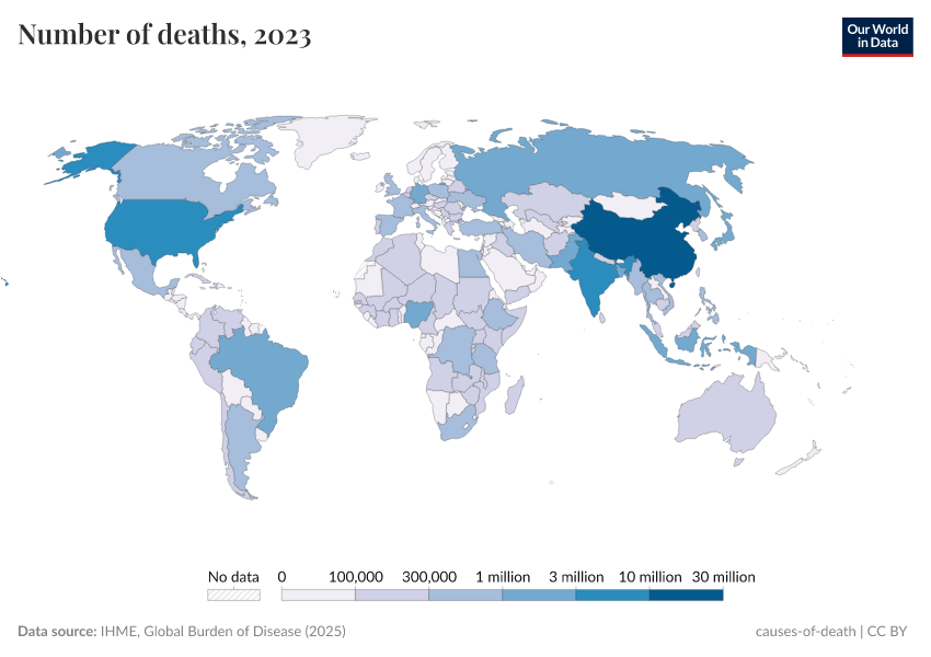 IHME, Global Burden of Disease (2024) – with minor processing by Our World in Data. “Number of deaths” [dataset]. IHME, Global Burden of Disease, “Global Burden of Disease - Deaths and DALYs” [original data]. Retrieved June 26, 2025 from https://remove-datapage-tags.owid.pages.dev/grapher/number-of-deaths-gbd