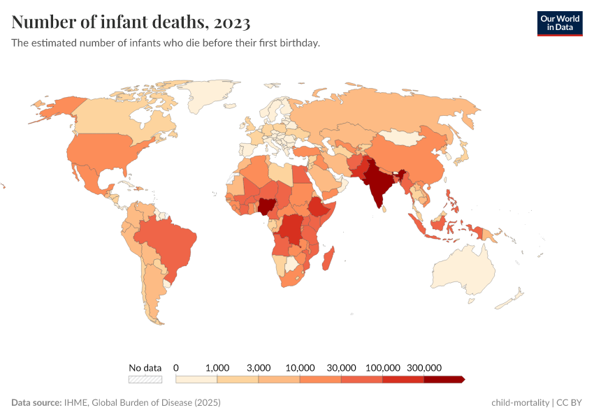 IHME, Global Burden of Disease (2024) – with minor processing by Our World in Data. “Number of infant deaths” [dataset]. IHME, Global Burden of Disease, “Global Burden of Disease - Child Mortality” [original data]. Retrieved June 26, 2025 from https://remove-datapage-tags.owid.pages.dev/grapher/number-of-infant-deaths-ihme
