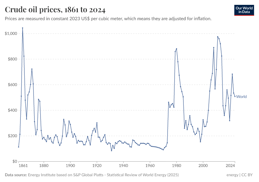 “Data Page: Oil price - Crude prices since 1861”, part of the following publication: Hannah Ritchie, Pablo Rosado, and Max Roser (2023) - “Energy”. Data adapted from Energy Institute. Retrieved from https://remove-datapage-tags.owid.pages.dev/grapher/oil-prices-inflation-adjusted [online resource]How to cite this data