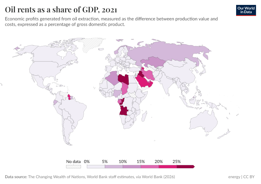 The Changing Wealth of Nations, World Bank (2025) – processed by Our World in Data. “Oil rents as a share of GDP” [dataset]. The Changing Wealth of Nations, World Bank, “World Development Indicators” [original data]. Retrieved June 26, 2025 from https://remove-datapage-tags.owid.pages.dev/grapher/oil-rents-as-a-share-of-gdp