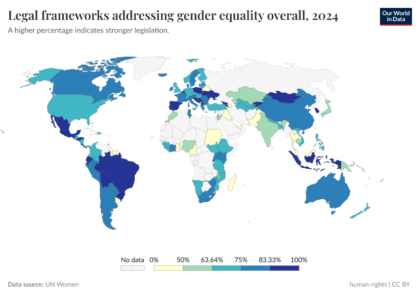 “Data Page: Legal frameworks addressing gender equality overall”. Our World in Data (2025). Data adapted from UN Women. Retrieved from https://remove-datapage-tags.owid.pages.dev/grapher/overarching-legal-frameworks-regarding-gender-equality [online resource]How to cite this data
