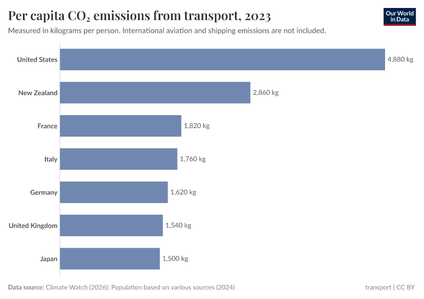 “Data Page: Per capita CO₂ emissions from transport”, part of the following publication: Hannah Ritchie, Pablo Rosado, and Max Roser (2023) - “CO₂ and Greenhouse Gas Emissions”. Data adapted from Climate Watch, Various sources. Retrieved from https://remove-datapage-tags.owid.pages.dev/grapher/per-capita-co2-transport [online resource]How to cite this data