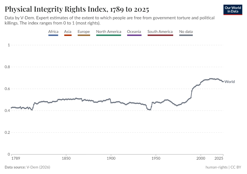 V-Dem (2025) – processed by Our World in Data. “Physical violence index – V-Dem” [dataset]. V-Dem, “Democracy report v15” [original data]. Retrieved June 26, 2025 from https://remove-datapage-tags.owid.pages.dev/grapher/physical-integrity-rights-index-vdem