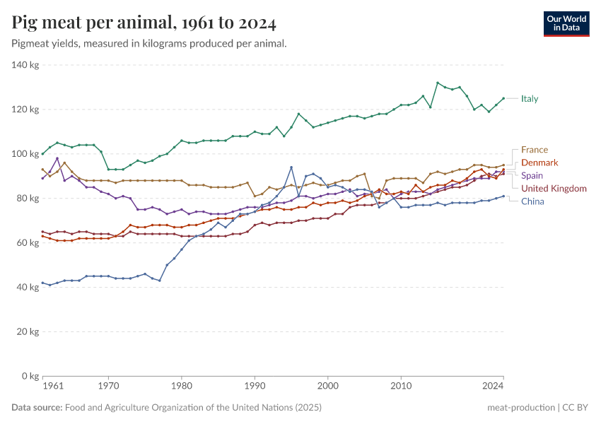Food and Agriculture Organization of the United Nations (2025) – with major processing by Our World in Data. “Pig meat yield per animal – FAO” [dataset]. Food and Agriculture Organization of the United Nations, “Production: Crops and livestock products” [original data]. Retrieved June 26, 2025 from https://remove-datapage-tags.owid.pages.dev/grapher/pig-yields-meat-per-animal-in-hectograms-100-grams