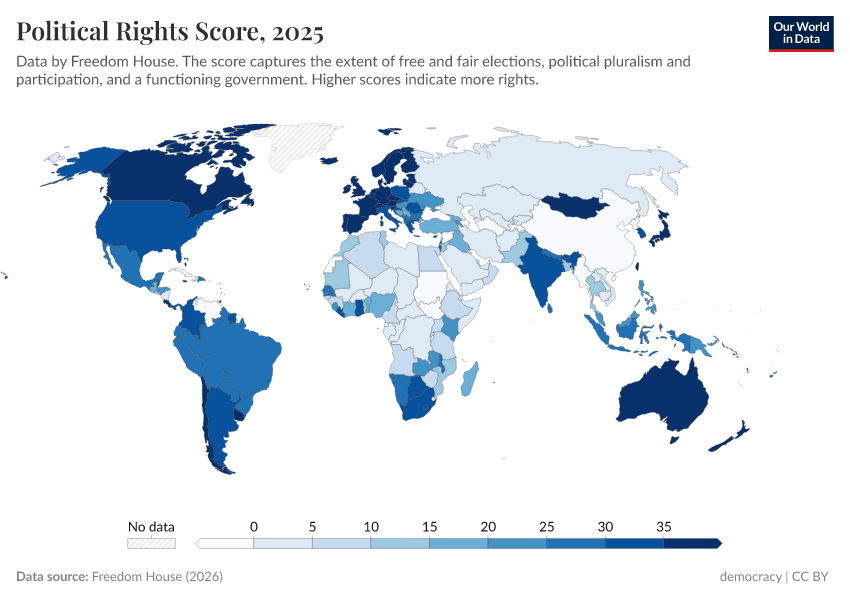 Freedom House (2025) – processed by Our World in Data. “Political rights score” [dataset]. Freedom House, “Freedom in the World” [original data]. Retrieved June 26, 2025 from https://remove-datapage-tags.owid.pages.dev/grapher/political-rights-score-fh