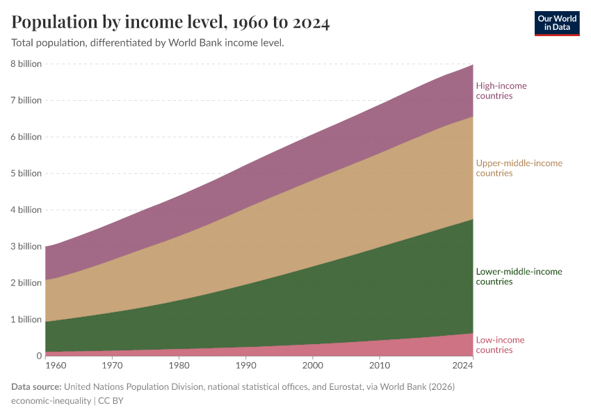 “Data Page: Population by income level”. Our World in Data (2025). Data adapted from United Nations Population Division, Eurostat, national statistical offices, and United Nations Statistics Division, via World Bank. Retrieved from https://remove-datapage-tags.owid.pages.dev/grapher/population-by-income-level [online resource]How to cite this data