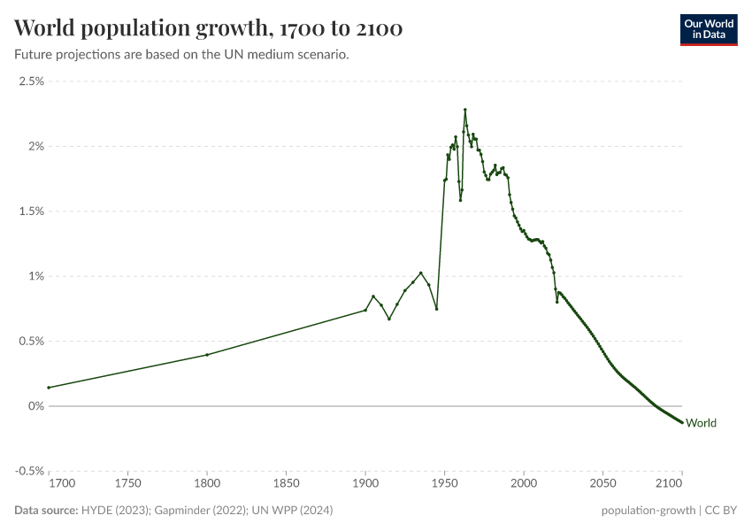 HYDE (2023); Gapminder (2022); UN WPP (2024) – with major processing by Our World in Data. “World population growth” [dataset]. PBL Netherlands Environmental Assessment Agency, “History Database of the Global Environment 3.3”; Gapminder, “Population v7”; United Nations, “World Population Prospects”; Gapminder, “Systema Globalis” [original data]. Retrieved June 26, 2025 from https://remove-datapage-tags.owid.pages.dev/grapher/population-growth-rate