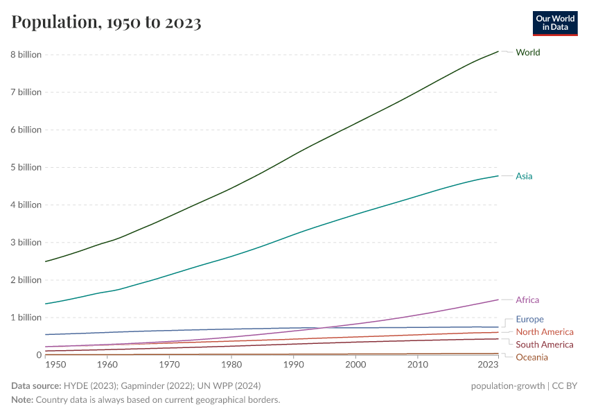 1950-2023: Population records by the UN World Population Prospects (2024 revision).