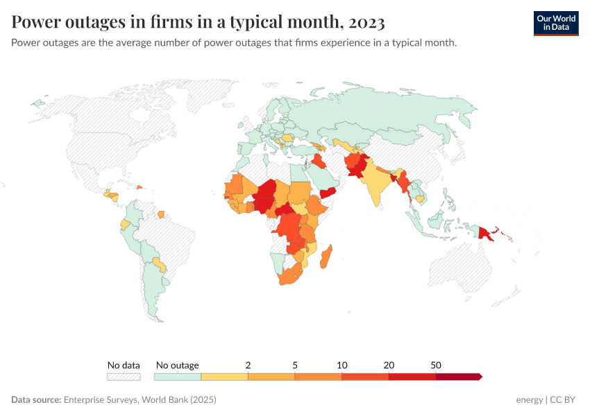 “Data Page: Power outages in firms in a typical month”. Our World in Data (2025). Data adapted from Enterprise Surveys, World Bank. Retrieved from https://remove-datapage-tags.owid.pages.dev/grapher/power-outages-in-firms-per-month [online resource]