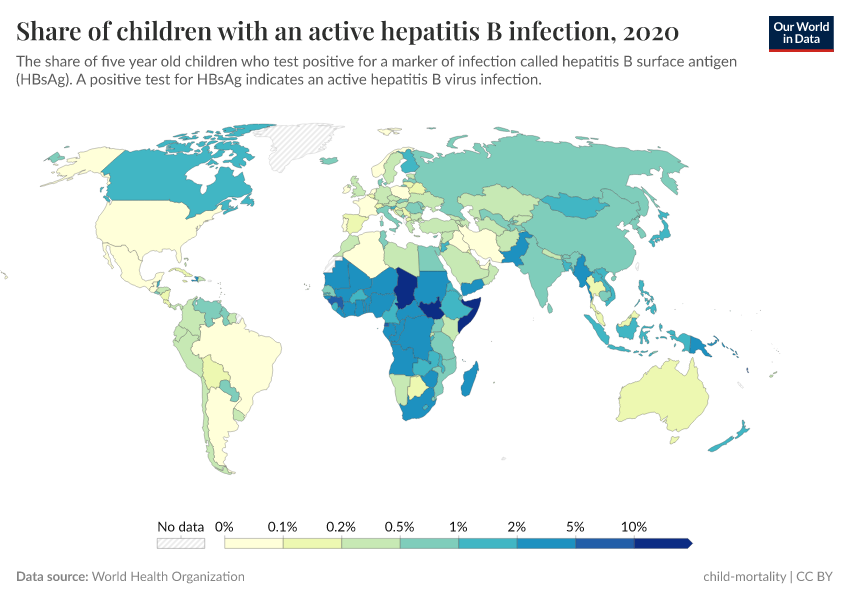 “Data Page: Share of children with an active hepatitis B infection”. Our World in Data (2025). Data adapted from World Health Organization. Retrieved from https://remove-datapage-tags.owid.pages.dev/grapher/prevalence-of-hepatitis-b-surface-antigen [online resource]How to cite this data