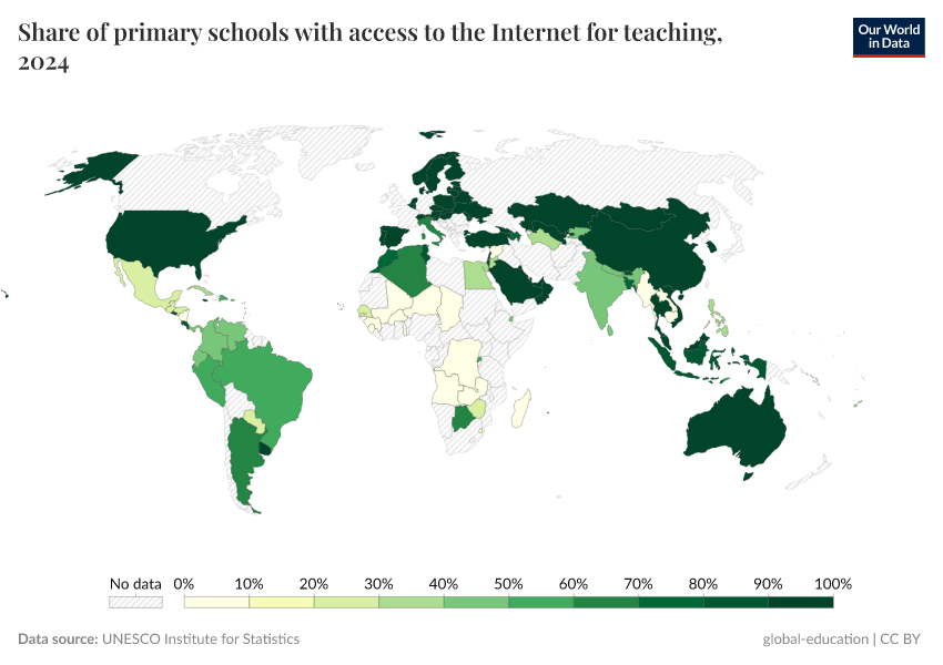 “Data Page: Share of primary schools with access to the Internet for teaching”. Our World in Data (2025). Data adapted from UNESCO Institute for Statistics. Retrieved from https://remove-datapage-tags.owid.pages.dev/grapher/primary-schools-with-access-to-internet [online resource]How to cite this data