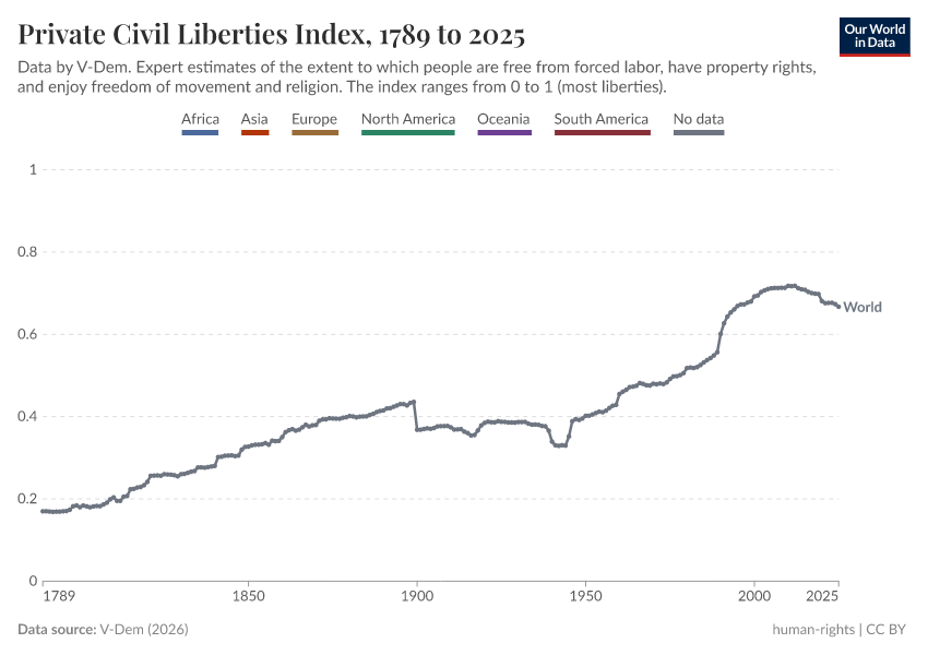 “Data Page: Private civil liberties index”, part of the following publication: Bastian Herre, Lucas Rodés-Guirao, and Esteban Ortiz-Ospina (2013) - “Democracy”. Data adapted from V-Dem. Retrieved from https://remove-datapage-tags.owid.pages.dev/grapher/private-civil-liberties-index [online resource]How to cite this data