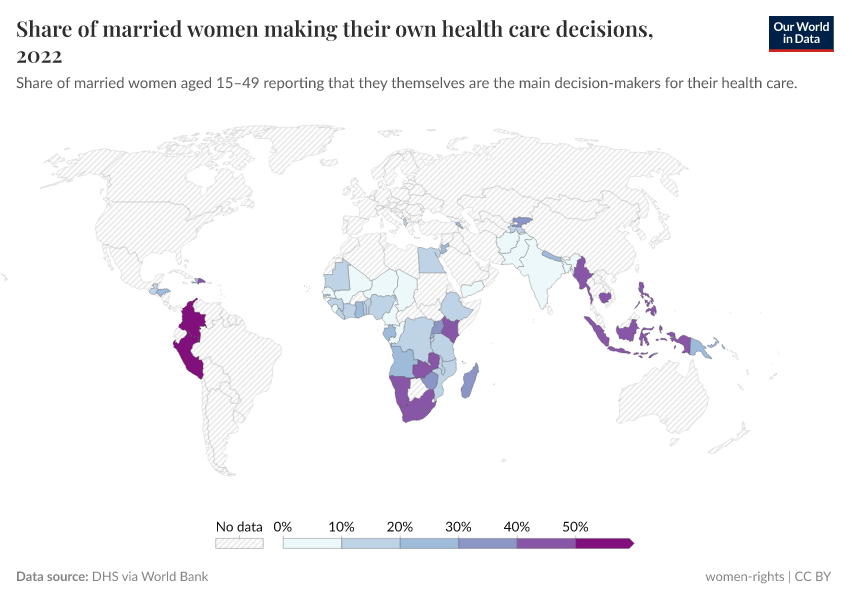 World Bank - Women, Business and the Law (2024) – processed by Our World in Data. “Share of women who make their own informed health care decisions” [dataset]. World Bank - Women, Business and the Law, “World Bank Gender Statistics” [original data]. Retrieved June 26, 2025 from https://remove-datapage-tags.owid.pages.dev/grapher/proportion-of-women-who-make-their-own-informed-health-care-decisions