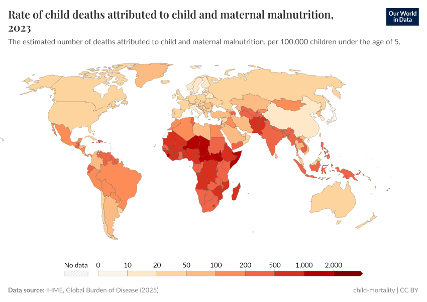 IHME, Global Burden of Disease (2024) – with minor processing by Our World in Data. “Rate of child deaths attributed to child and maternal malnutrition” [dataset]. IHME, Global Burden of Disease, “Global Burden of Disease - Risk Factors” [original data]. Retrieved June 26, 2025 from https://remove-datapage-tags.owid.pages.dev/grapher/rate-of-child-deaths-attributed-to-child-and-maternal-malnutrition