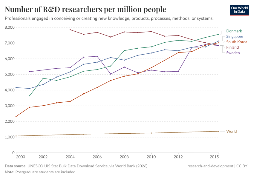 UNESCO Institute for Statistics (UIS), via World Bank (2025) – processed by Our World in Data. “Number of R&D researchers per million people” [dataset]. UNESCO Institute for Statistics (UIS), via World Bank, “World Development Indicators” [original data]. Retrieved June 26, 2025 from https://remove-datapage-tags.owid.pages.dev/grapher/researchers-in-rd-per-million-people