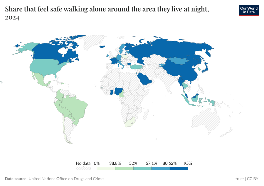 United Nations Office on Drugs and Crime – processed by Our World in Data. “Share that feel safe walking alone around the area they live at night” [dataset]. United Nations Office on Drugs and Crime, “Data from multiple sources” [original data]. Retrieved June 26, 2025 from https://remove-datapage-tags.owid.pages.dev/grapher/safety-walking-alone