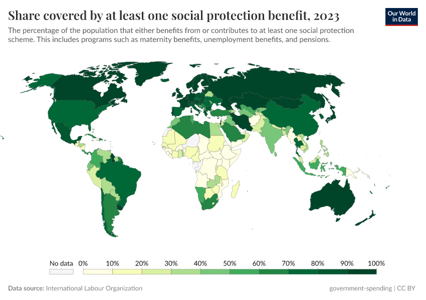 “Data Page: Share covered by at least one social protection benefit”. Our World in Data (2025). Data adapted from International Labour Organization. Retrieved from https://remove-datapage-tags.owid.pages.dev/grapher/share-covered-by-one-social-protection-benefit [online resource]How to cite this data