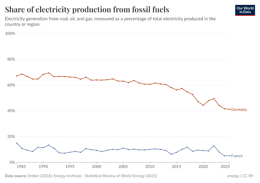 “Data Page: Share of electricity generated by fossil fuels”, part of the following publication: Hannah Ritchie, Pablo Rosado, and Max Roser (2023) - “Energy”. Data adapted from Ember, Energy Institute. Retrieved from https://remove-datapage-tags.owid.pages.dev/grapher/share-electricity-fossil-fuels [online resource]