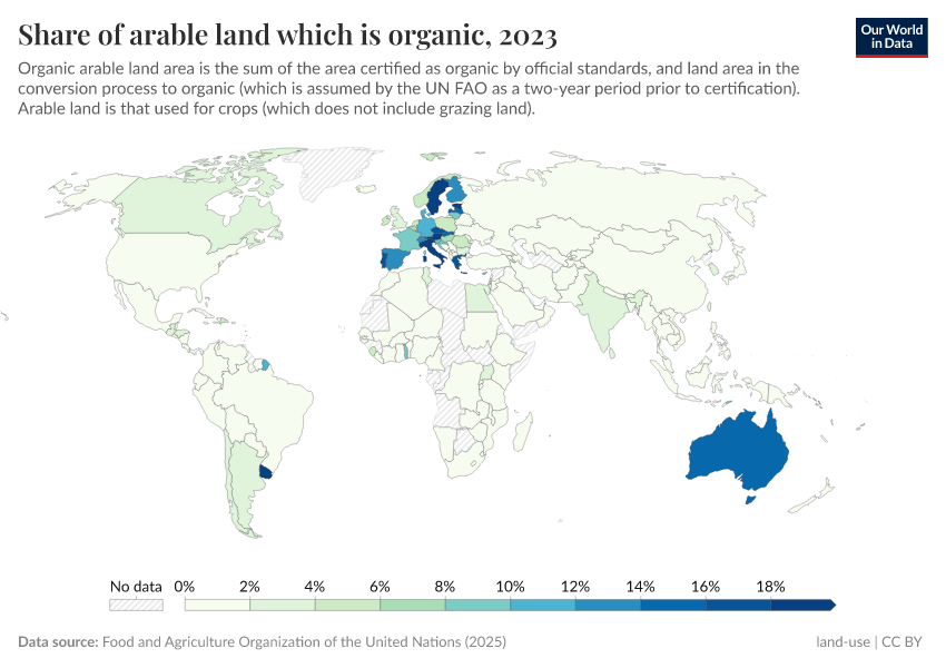 Food and Agriculture Organization of the United Nations (2024) – with major processing by Our World in Data. “Share of arable land that is organic – FAO” [dataset]. Food and Agriculture Organization of the United Nations, “Land, Inputs and Sustainability: Land Use” [original data]. Retrieved June 26, 2025 from https://remove-datapage-tags.owid.pages.dev/grapher/share-of-arable-land-which-is-organic