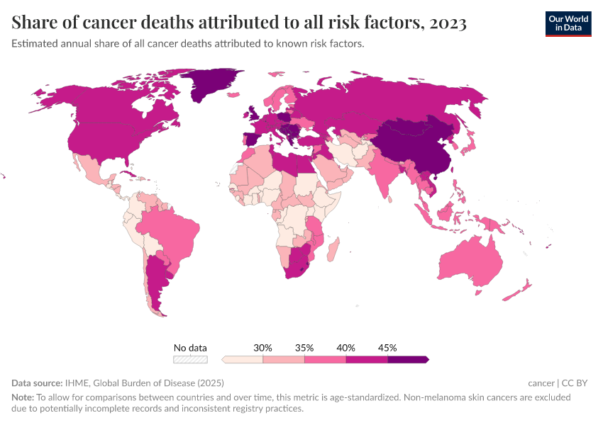 IHME, Global Burden of Disease (2024) – processed by Our World in Data. “Share of cancer deaths attributed to all risk factors” [dataset]. IHME, Global Burden of Disease, “Global Burden of Disease - Risk Factors for Cancer Deaths” [original data]. Retrieved June 26, 2025 from https://remove-datapage-tags.owid.pages.dev/grapher/share-of-cancer-deaths-attributed-to-all-risk-factors