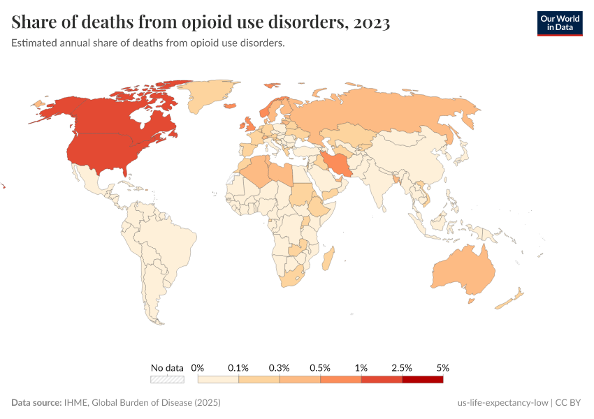IHME, Global Burden of Disease (2024) – with minor processing by Our World in Data. “Share of deaths from opioid use disorders” [dataset]. IHME, Global Burden of Disease, “Global Burden of Disease - Deaths and DALYs” [original data]. Retrieved June 26, 2025 from https://remove-datapage-tags.owid.pages.dev/grapher/share-of-deaths-from-opioid-overdoses