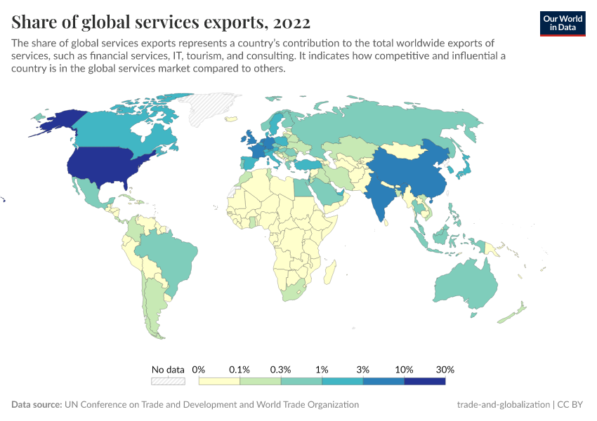 “Data Page: Share of global services exports”. Our World in Data (2025). Data adapted from UN Conference on Trade and Development and World Trade Organization. Retrieved from https://remove-datapage-tags.owid.pages.dev/grapher/share-of-global-services-exports [online resource]How to cite this data
