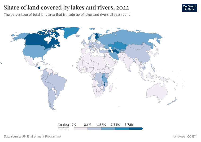 “Data Page: Share of land covered by lakes and rivers”. Our World in Data (2025). Data adapted from UN Environment Programme. Retrieved from https://remove-datapage-tags.owid.pages.dev/grapher/share-of-land-covered-by-lakes-and-rivers [online resource]How to cite this data