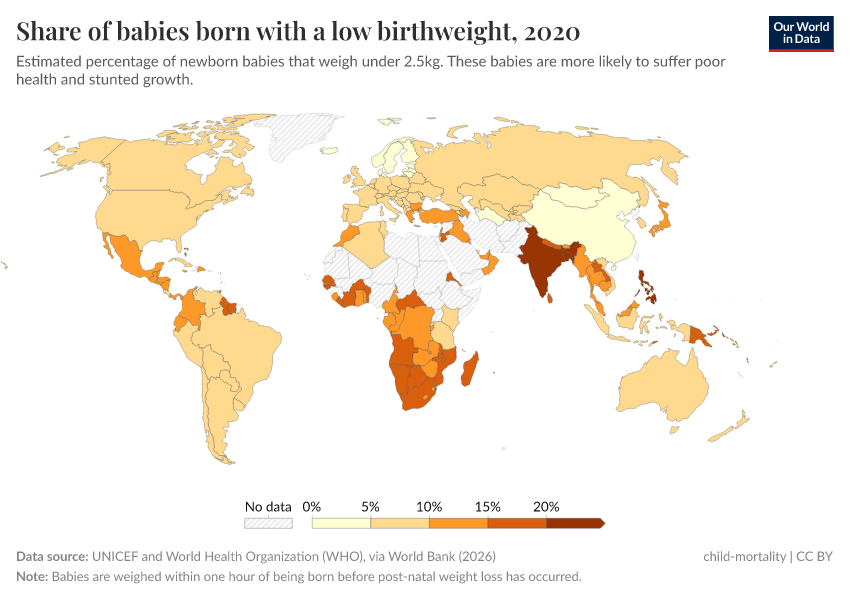 “Data Page: Share of babies born with a low birthweight”. Our World in Data (2025). Data adapted from UNICEF and World Health Organization, via World Bank. Retrieved from https://remove-datapage-tags.owid.pages.dev/grapher/share-of-low-birthweight-babies-born [online resource]How to cite this data