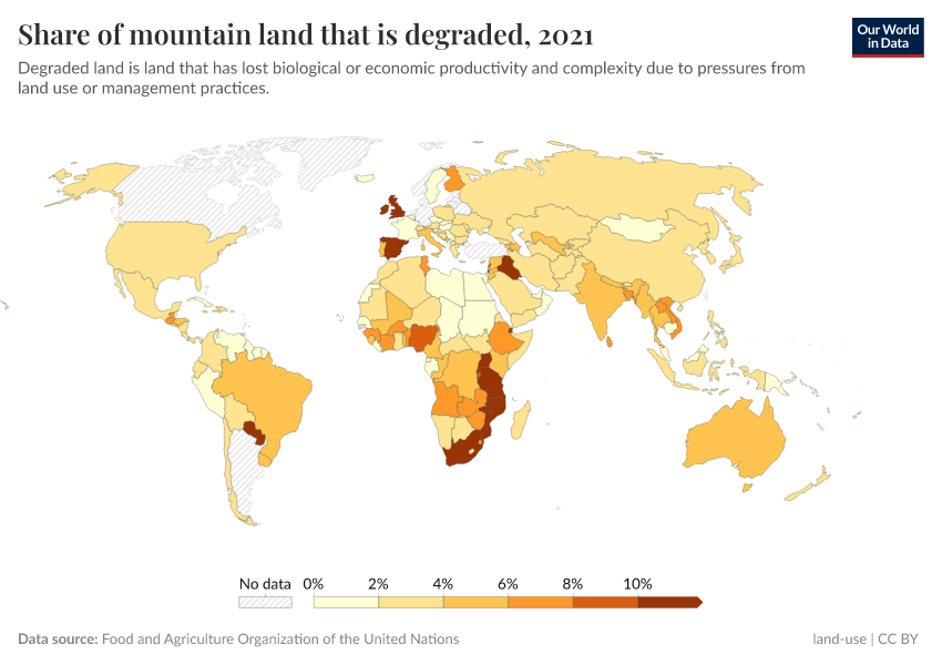 Food and Agriculture Organization of the United Nations – processed by Our World in Data. “Share of mountain land that is degraded” [dataset]. Food and Agriculture Organization of the United Nations, “Food and Agriculture Organization of the United Nations (FAO)” [original data]. Retrieved June 26, 2025 from https://remove-datapage-tags.owid.pages.dev/grapher/share-of-mountain-land-that-is-degraded