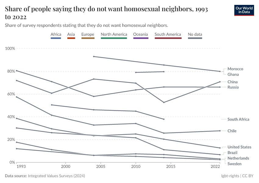 Integrated Values Surveys (2022) – with major processing by Our World in Data. “Share of people saying they do not want homosexual neighbors – Integrated Values Surveys” [dataset]. Integrated Values Surveys, “Integrated Values Surveys (IVS) Version 3” [original data]. Retrieved June 26, 2025 from https://remove-datapage-tags.owid.pages.dev/grapher/share-of-people-saying-they-do-not-want-homosexual-neighbors