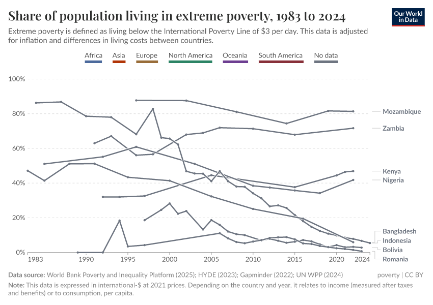 World Bank Poverty and Inequality Platform (2024) – with major processing by Our World in Data. “Share of population living in extreme poverty – World Bank” [dataset]. World Bank Poverty and Inequality Platform, “World Bank Poverty and Inequality Platform (PIP) 20240627_2017, 20240627_2011” [original data]. Retrieved June 26, 2025 from https://remove-datapage-tags.owid.pages.dev/grapher/share-of-population-in-extreme-poverty