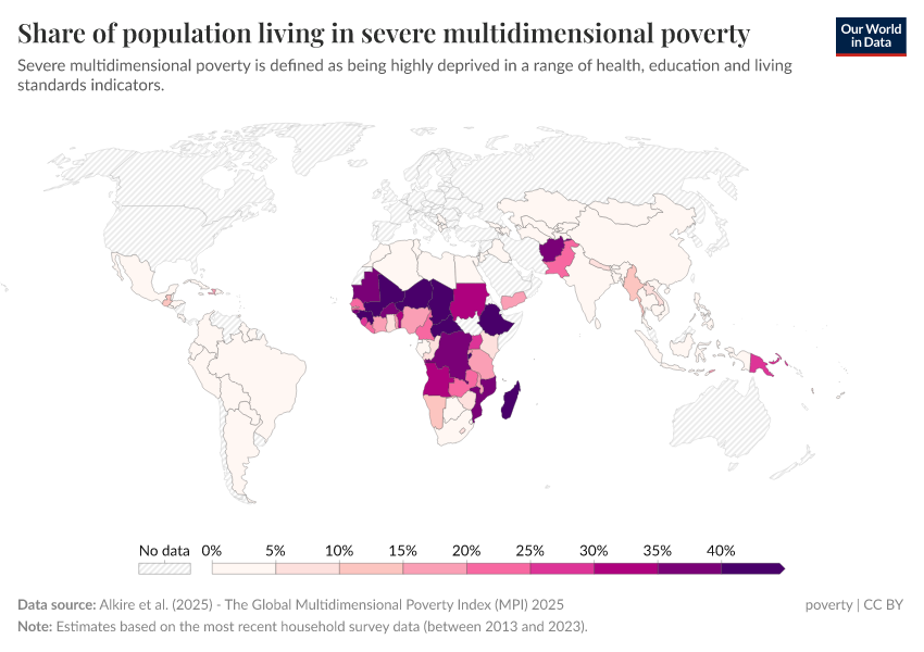 “Data Page: Share of population living in severe multidimensional poverty”, part of the following publication: Joe Hasell, Bertha Rohenkohl, Pablo Arriagada, Esteban Ortiz-Ospina, and Max Roser (2022) - “Poverty”. Data adapted from Alkire, Kanagaratnam and Suppa. Retrieved from https://remove-datapage-tags.owid.pages.dev/grapher/share-of-population-in-severe-multidimensional-poverty [online resource]How to cite this data