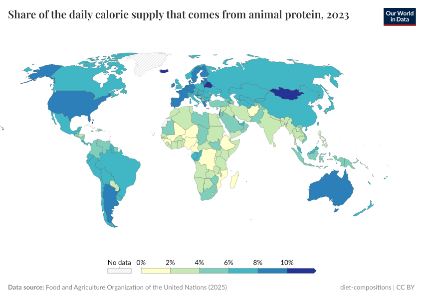 “Data Page: Share of the daily calorie supply that comes from animal protein”, part of the following publication: Hannah Ritchie, Pablo Rosado, and Max Roser (2023) - “Agricultural Production”. Data adapted from Food and Agriculture Organization of the United Nations. Retrieved from https://remove-datapage-tags.owid.pages.dev/grapher/share-of-the-daily-calorie-supply-that-comes-from-animal-protein [online resource]How to cite this data