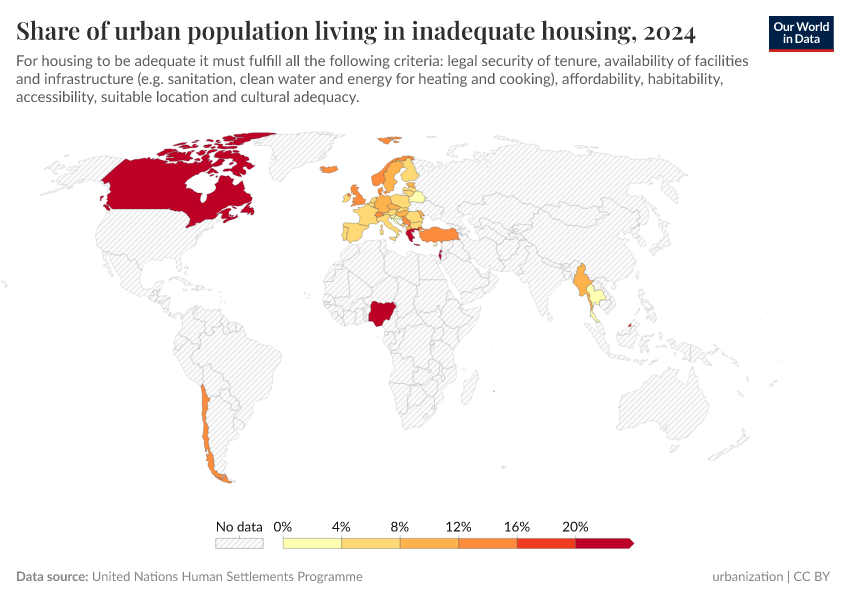 “Data Page: Share of urban population living in inadequate housing”. Our World in Data (2025). Data adapted from United Nations Human Settlements Programme. Retrieved from https://remove-datapage-tags.owid.pages.dev/grapher/share-of-urban-population-living-in-inadequate-housing [online resource]How to cite this data