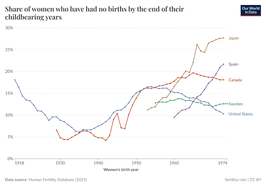 “Data Page: Share of women who have had no births by the end of their childbearing years”, part of the following publication: Saloni Dattani, Lucas Rodés-Guirao, and Max Roser (2025) - “Fertility Rate”. Data adapted from Human Fertility Database. Retrieved from https://remove-datapage-tags.owid.pages.dev/grapher/share-of-women-who-have-had-no-births-across-their-childbearing-years [online resource]How to cite this data
