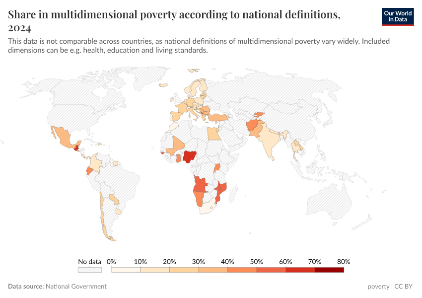 “Data Page: Share in multidimensional poverty according to national definitions”. Our World in Data (2025). Data adapted from World Bank, UNICEF and United Nations Development Programme. Retrieved from https://remove-datapage-tags.owid.pages.dev/grapher/share-people-multidimensional-poverty-national-definitions [online resource]How to cite this data