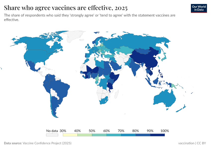 Vaccine Confidence Project (2025) – processed by Our World in Data. “Share who agree vaccines are effective” [dataset]. Vaccine Confidence Project, “Vaccine Confidence Index” [original data]. Retrieved June 26, 2025 from https://remove-datapage-tags.owid.pages.dev/grapher/share-who-agree-vaccines-are-effective