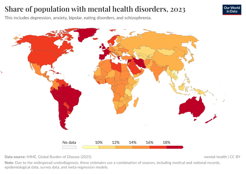 IHME, Global Burden of Disease (2024) – with major processing by Our World in Data. “Share of population with mental health disorders” [dataset]. IHME, Global Burden of Disease, “Global Burden of Disease - Prevalence and Incidence” [original data]. Retrieved June 26, 2025 from https://remove-datapage-tags.owid.pages.dev/grapher/share-with-mental-and-substance-disorders