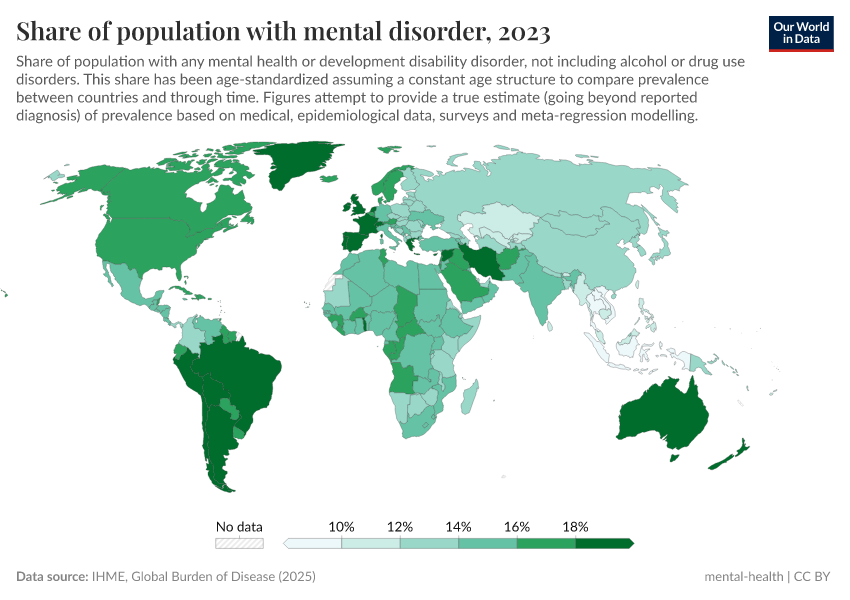 IHME, Global Burden of Disease (2024) – with major processing by Our World in Data. “Share of population with mental disorder” [dataset]. IHME, Global Burden of Disease, “Global Burden of Disease - Mental Health Prevalence” [original data]. Retrieved June 26, 2025 from https://remove-datapage-tags.owid.pages.dev/grapher/share-with-mental-health-or-development-disorder