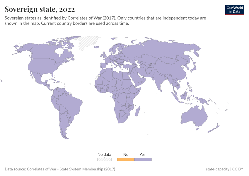 “Data Page: Sovereign state”, part of the following publication: Bastian Herre and Pablo Arriagada (2023) - “State Capacity”. Data adapted from Correlates of War. Retrieved from https://remove-datapage-tags.owid.pages.dev/grapher/sovereign-state-cow [online resource]How to cite this data