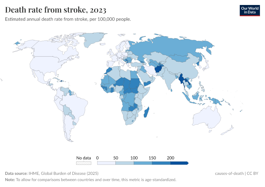 IHME, Global Burden of Disease (2024) – with minor processing by Our World in Data. “Death rate from stroke” [dataset]. IHME, Global Burden of Disease, “Global Burden of Disease - Deaths and DALYs” [original data]. Retrieved June 26, 2025 from https://remove-datapage-tags.owid.pages.dev/grapher/stroke-death-rates