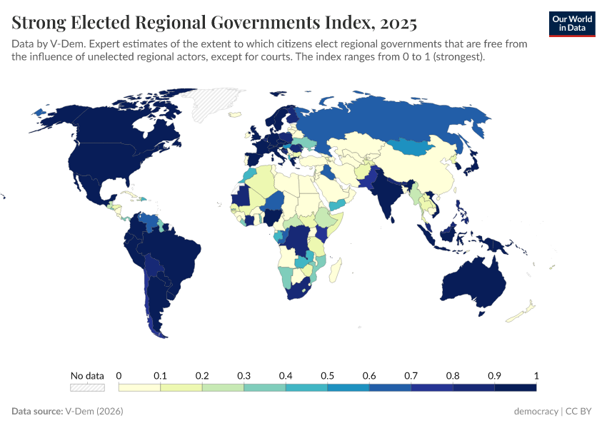 “Data Page: Elected regional governments”, part of the following publication: Bastian Herre, Lucas Rodés-Guirao, and Esteban Ortiz-Ospina (2013) - “Democracy”. Data adapted from V-Dem. Retrieved from https://remove-datapage-tags.owid.pages.dev/grapher/strong-elected-regional-governments-index [online resource]How to cite this data
