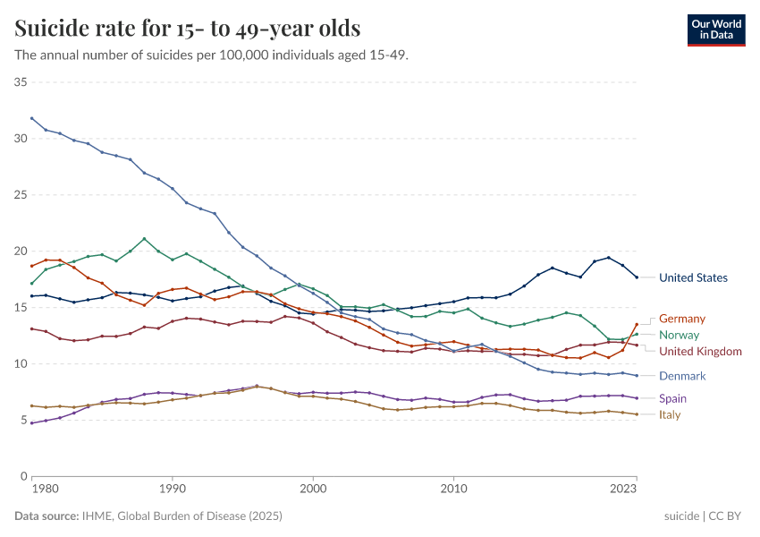 IHME, Global Burden of Disease (2024) – with minor processing by Our World in Data. “Suicide rate for 15- to 49-year olds” [dataset]. IHME, Global Burden of Disease, “Global Burden of Disease - Deaths and DALYs” [original data]. Retrieved June 26, 2025 from https://remove-datapage-tags.owid.pages.dev/grapher/suicide-rate-for-15--to-49-year-olds