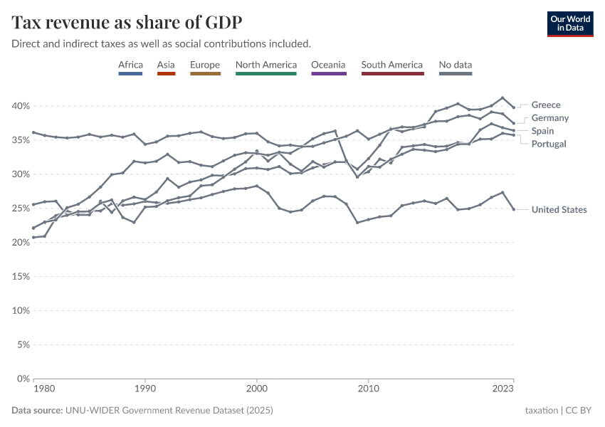 UNU-WIDER Government Revenue Dataset (2023) – with major processing by Our World in Data. “Tax revenues as a share of GDP – UNU-WIDER” [dataset]. UNU-WIDER, “Government Revenue Dataset (GRD) 2023” [original data]. Retrieved June 26, 2025 from https://remove-datapage-tags.owid.pages.dev/grapher/tax-revenues-as-a-share-of-gdp-unu-wider