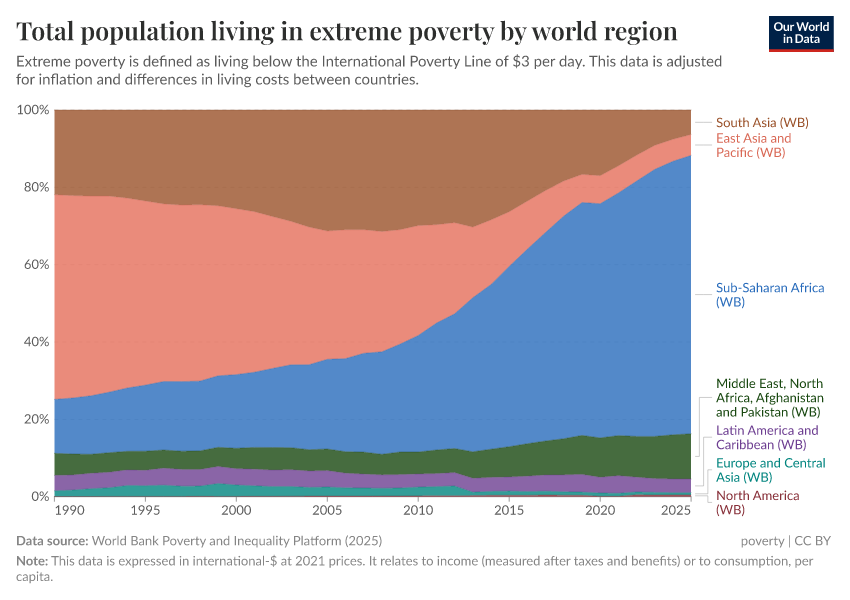 World Bank Poverty and Inequality Platform (2024) – with major processing by Our World in Data. “Total population living in extreme poverty by world region – World Bank” [dataset]. World Bank Poverty and Inequality Platform, “World Bank Poverty and Inequality Platform (PIP) 20240627_2017, 20240627_2011” [original data]. Retrieved June 26, 2025 from https://remove-datapage-tags.owid.pages.dev/grapher/total-population-living-in-extreme-poverty-by-world-region
