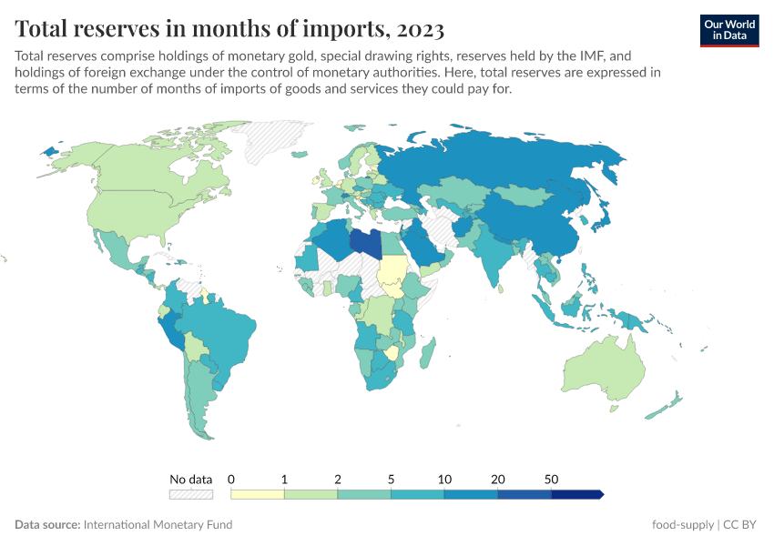 International Monetary Fund – processed by Our World in Data. “Total reserves in months of imports” [dataset]. International Monetary Fund, “International Monetary Fund, International Financial Statistics and data files.” [original data]. Retrieved June 26, 2025 from https://remove-datapage-tags.owid.pages.dev/grapher/total-reserves-in-months-of-imports