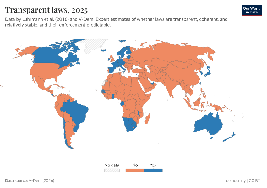 V-Dem (2025) – processed by Our World in Data. “Transparent laws with predictable enforcement – V-Dem” [dataset]. V-Dem, “Democracy report v15” [original data]. Retrieved June 26, 2025 from https://remove-datapage-tags.owid.pages.dev/grapher/transparent-laws-row